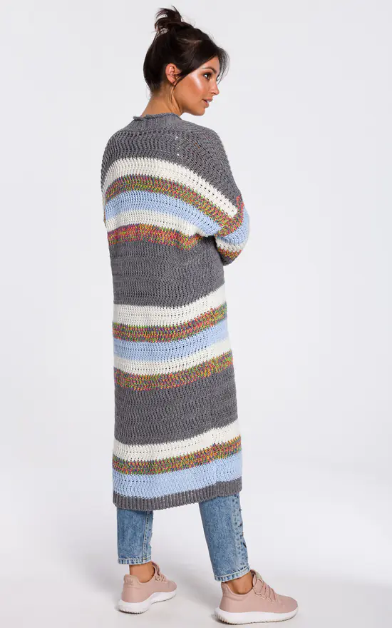 Interesting choice of colors and pattern make this longline cardigan not only a warm, but also a trendy piece you can wear both with you favorite jeans or t-shirt and a tube dress.