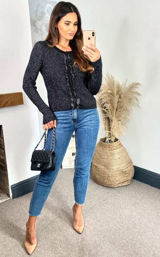 Stand out with this classy knit cardigan, featuring all over shimmer and ruffle trims for added elegance.