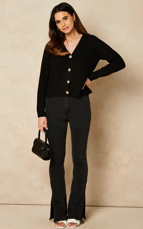 Cosy and chic, this black knitted V neck cardigan is the versatile layer you’ll be living in for this season.