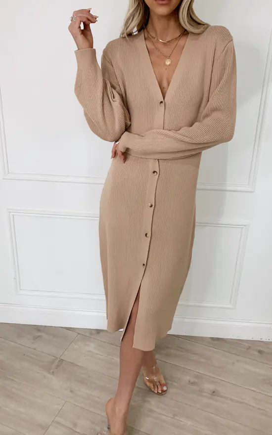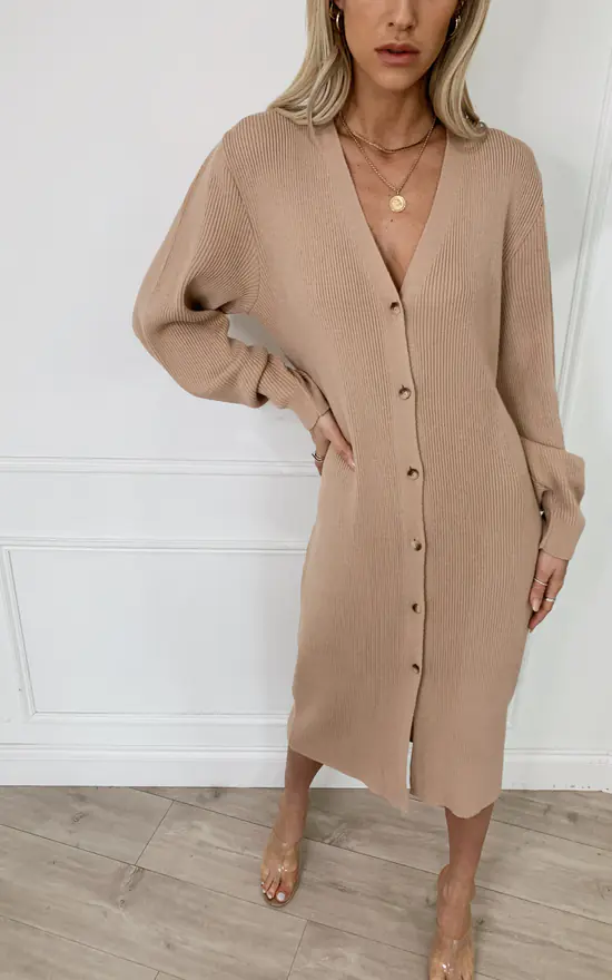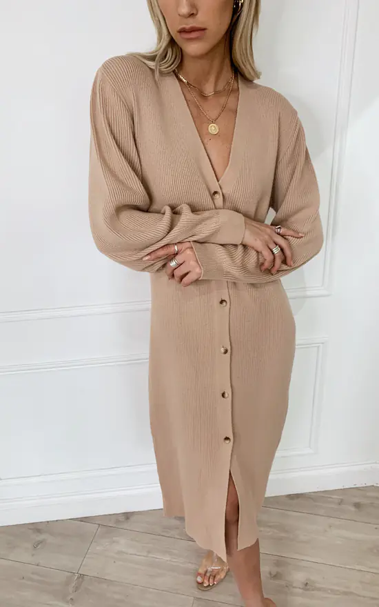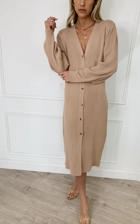 This maxi cardi is the perfect wardrobe piece for those “what shall I wear?” days. It can be dressed up with a pair of barely there’s, or kept casual with jeans and trainers. Made from a ribbed knit, with a v-neck line, balloon sleeves and tortoise shell buttons.