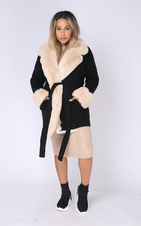 Our Black Faux Fur Belted Cardigan is part of our latest Coats and Jackets collection. Featuring a soft and warm knitted material, two front pockets, belt with belt hoops and a fur collar and cuffs.