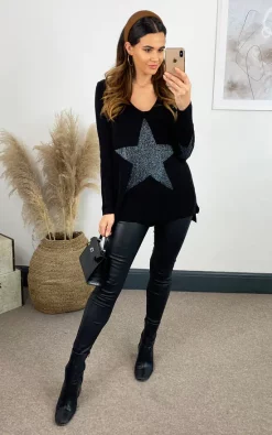 Best Pirce ???? HOXTON GAL Oversized Long Sleeves Relaxed Blue Star Jumper In Black ⌛
