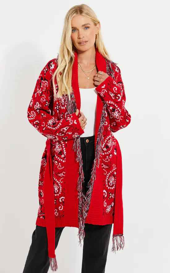 Wrap up warm with this red belted knitted cardigan from Threadbare. This cardigan features wide style sleeves, ribbed neckline, and hem. Other styles are available.