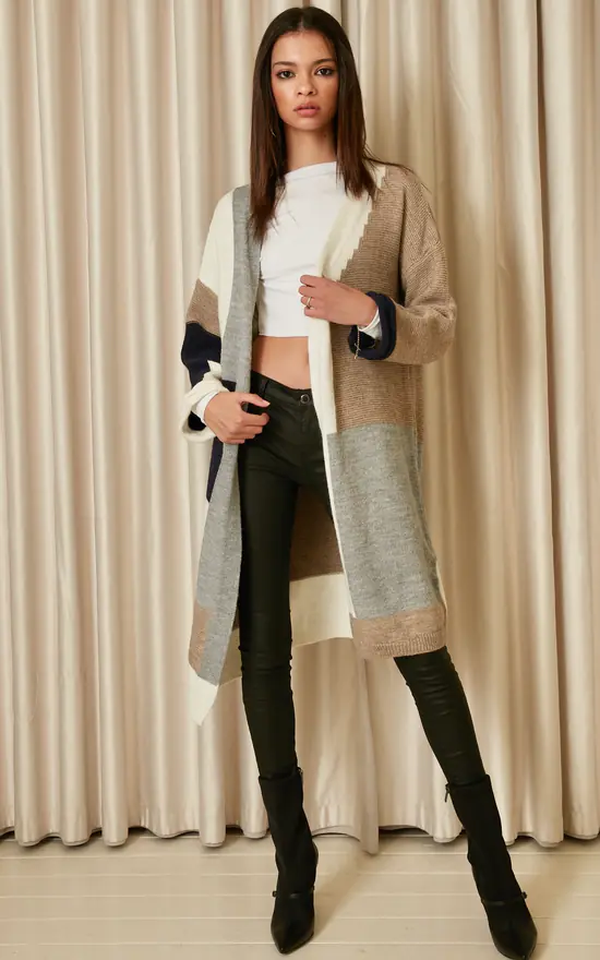 No autumn wardrobe is complete with a proper collection of cardigans! This color-blocked one will enter vibrancy into your existing lot of neutrals.