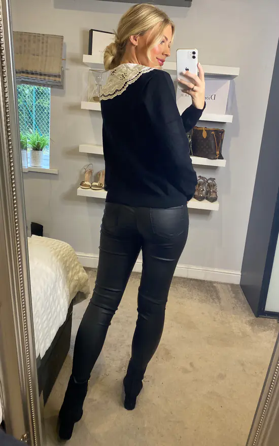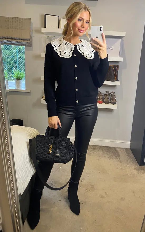 Staple knitwear doesn’t have to be dull. This black knitted cardigan features a statement white peter pan collar with cut out pattern and glistening silver diamante buttons.