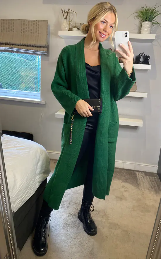An A/W wardrobe staple, this super soft Green knitted maxi cardigan is all about the long line fit, roomy pockets and stunning neutral shade. Perfect paired with jeans or a bodycon dress.